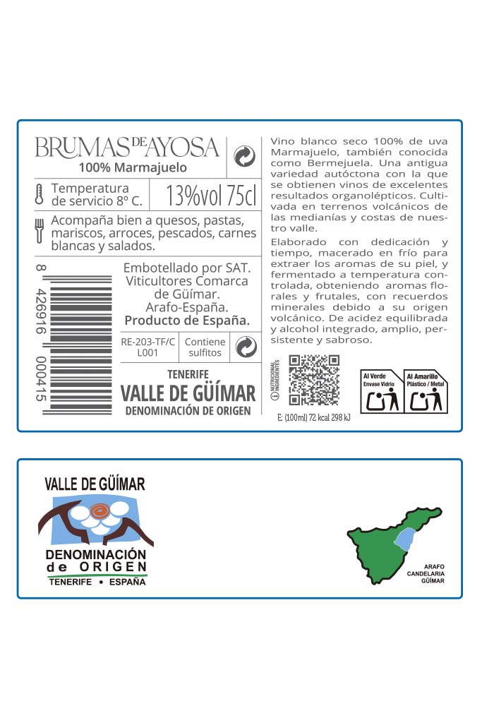 Vino blanco seco 100% de la variedad de uva Marmajuelo, también conocida como Bermejuela. Una antigua variedad autóctona redescubierta por nuestros viticultores con la que se obtienen vinos de excelentes resultados organolépticos. Se cultiva en terrenos volcánicos de las medianías y costas de nuestro valle. Temperatura de servicio 8º C